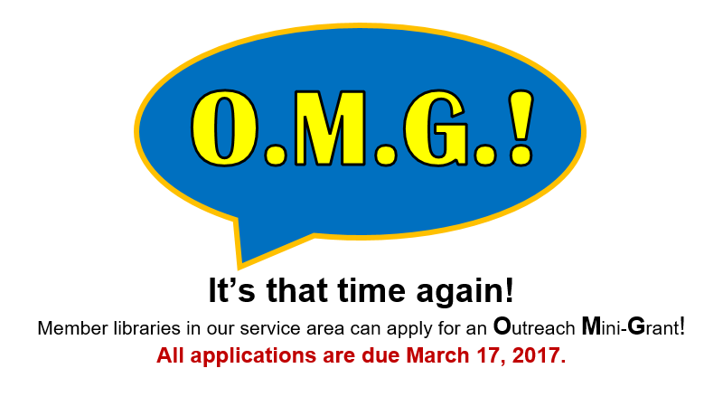 It’s that time again! Do you have an idea for an outreach project but lack funding? Member libraries in our service area can apply for an Outreach Mini-Grant! Applications are NOW OPEN for the 2017-2018 grant cycle! All applications are due March 17, 2017. Visit the Outreach Services page to download an application or to view the FAQs. Have a question? Stuck on an idea? Read our FAQs or email Jenny Shonk at jshonk@flls.org.