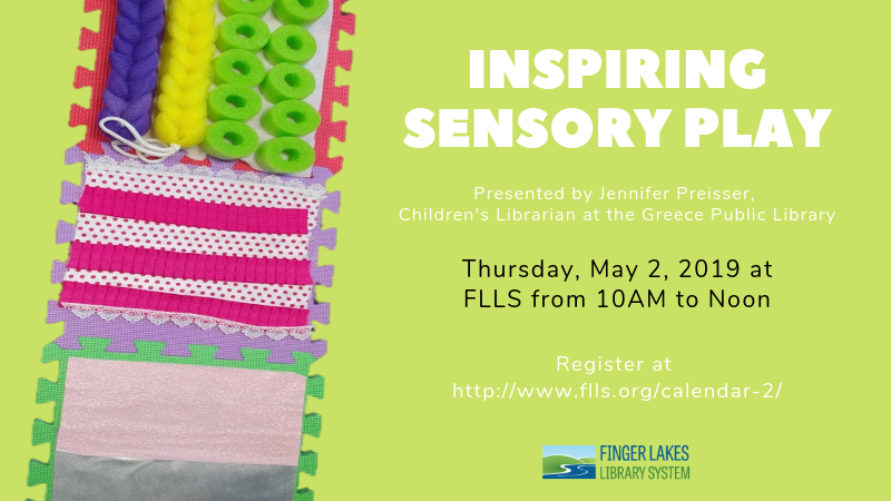 The Inspiring Sensory Play workshop will be held on Thursday, May 2, 2019 from 10am to 12pm at the Finger Lakes Library System.
